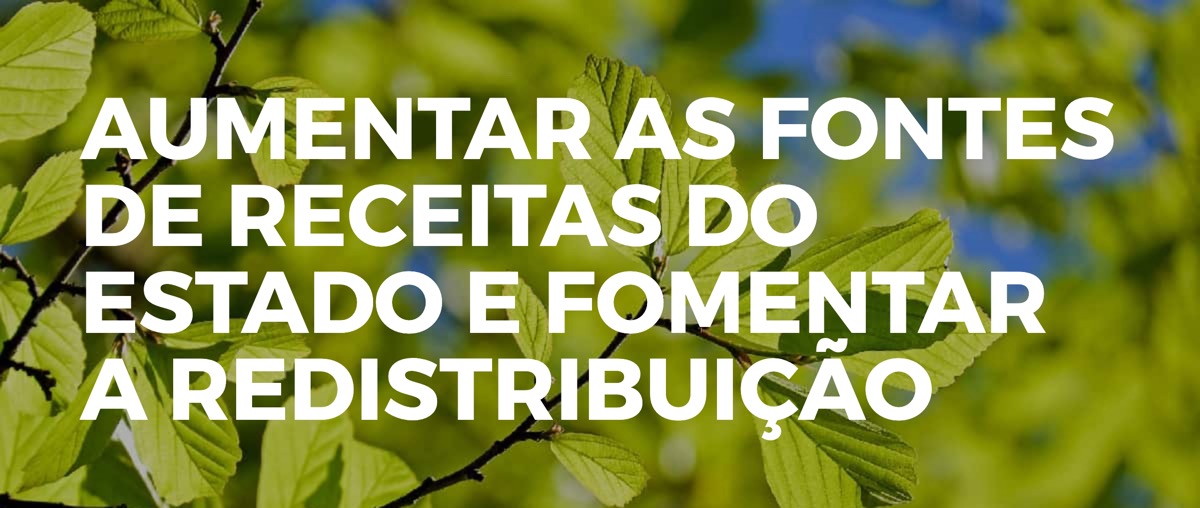 Aumentar as fontes de receitas do Estado e fomentar a redistribuição, através da recuperação dos juros pagos ao Eurosistema, do combate à evasão fiscal - nomeadamente para off-shores, da renegociação da dívida pública, da eliminação das rendas indevidas no setor energético, do reforço fiscal sobre património que não a habitação permanente e sobre as grandes fortunas, da taxação sobre as transações financeiras, da taxação das emissões de carbono e da produção de resíduos, da taxação das grandes empresas tecnológicas e digitais; precavendo as alterações de receita no futuro, nomeadamente a diminuição da receita do imposto sobre os combustíveis fósseis (atualmente a terceira fonte de rendimento do Estado) causada pela transição para outras formas de energia e a diminuição da receita fiscal proveniente dos impostos sobre o trabalho com a evolução da automação.