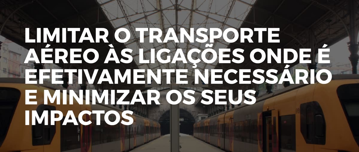 Limitar o transporte aéreo às ligações onde é efetivamente necessário e minimizar os seus impactos; garantir que o preço de uma viagem de avião não possa ser inferior ao da mesma viagem de comboio; retirando a isenção dos impostos sobre o combustível às companhias aéreas; estudando alternativas de localização para os aeroportos atualmente em zonas urbanas; travando a construção de quaisquer novos aeroportos em zonas ambientalmente sensíveis, como é o caso da proposta de novo aeroporto para a região de Lisboa; regulando o espaço aéreo e limitando os seus horários.
