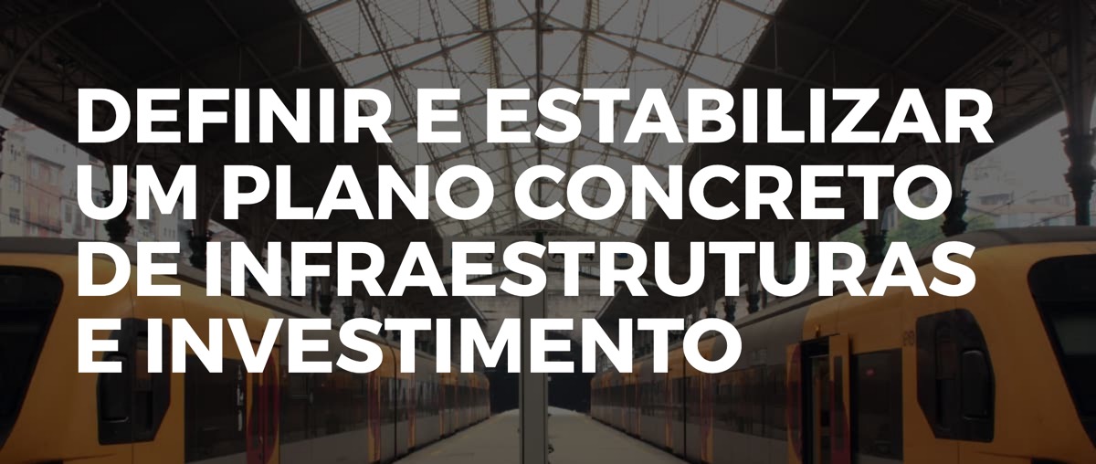Definir e estabilizar um plano concreto de infraestruturas e investimento integrado com o PNPOT e que inclua um Plano Nacional de Mobilidade, planeando a médio-longo prazo com uma verdadeira análise de ciclo de vida e de externalidades da construção e operação, articulando as necessidades de todos os setores e tendo em conta as evoluções tecnológicas, demográficas e climáticas perspetivadas; prevendo nomeadamente a evolução das redes ferroviárias e de metropolitanos, incluindo ligações de alta velocidade e de transporte de mercadorias, articulada com um plano de aquisição e reparação de comboios e material circulante.