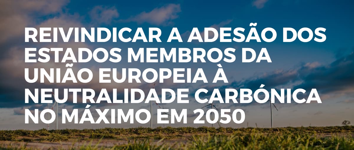 Reivindicar a adesão dos Estados Membros da União Europeia à Neutralidade Carbónica no máximo em 2050, em cumprimento da estratégia para a neutralidade carbónica da União Europeia e incluindo a consideração do transporte aéreo e marítimo na pegada carbónica dos países.