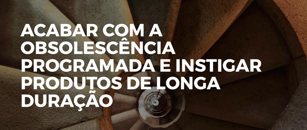 Acabar com a obsolescência programada e instigar produtos de longa duração, pressionando para a implementação a nível nacional e europeu de um programa para combater a obsolescência programada; favorecendo os produtos “feitos para durar” e que permitam reparação ou substituição de componentes; criminalizando a obsolescência programada propositada; taxando os negócios que produzem produtos de utilização limitada (excepto em situações específicas, como nos consumíveis de saúde) e proibindo os produtos descartáveis cujos impactos sejam particularmente severos.
