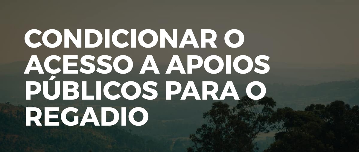 Condicionar o acesso a apoios públicos para o regadio, em explorações superiores a 100 ha, à adoção de sistemas produtivos agro-silvo-pastoris, comprovando os três tipos de produção, bem como à capacidade de suportar localmente pelo menos 50% das necessidades de água e nutrientes.
