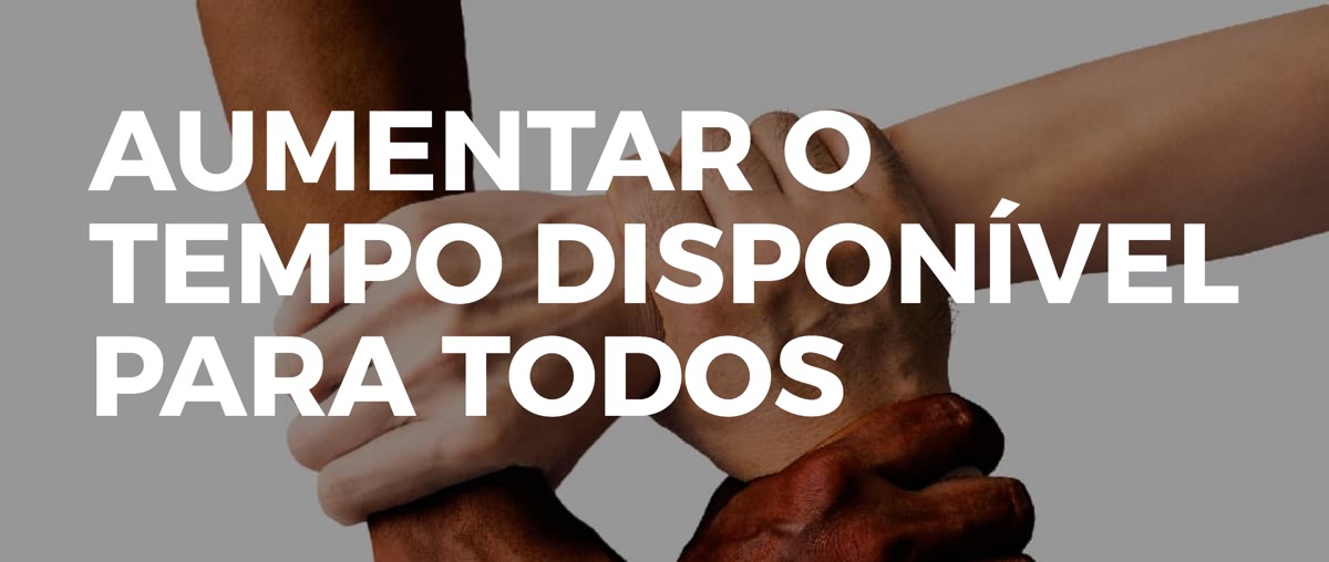 Aumentar o tempo disponível para todos, através da redução geral do horário de trabalho para 30h semanais e do aumento dos dias de férias para os 30 dias anuais,de forma progressiva em ambos os casos, assim garantindo uma maior distribuição do trabalho; através do não aumento da idade mínima de reforma, com planeamento para a sua redução (diminuindo o tempo de resposta ao pedido de reforma); permitindo a redução do horário de trabalho em função da idade do trabalhador sem perda de rendimento em vez da reforma total.